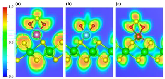 ELF distributions of SO2 adsorbed on (a) Sc-, (b) Ti-, and (c) V-decorated ZrS2 systems. The plots highlight the ELF features around the adsorption sites. Blue and red denote ELF values of 0 and 1, respectively.
