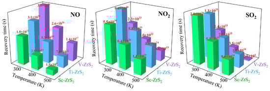 The recovery time is an important parameter for gas sensors, which is directly related to the adsorption properties of the material and the sensor’s reusability [81]. The recovery time affects the sensor response speed and also determines its stability and reliability in practical applications. As shown in Figure 11, ZrS2 monolayers decorated with TM (Sc, Ti and V) show significantly different recovery times for NO, NO2 and SO2. The recovery time (τ) was estimated using the van’t Hoff-Arrhenius relation within the framework of transition state theory, as expressed by [82]: