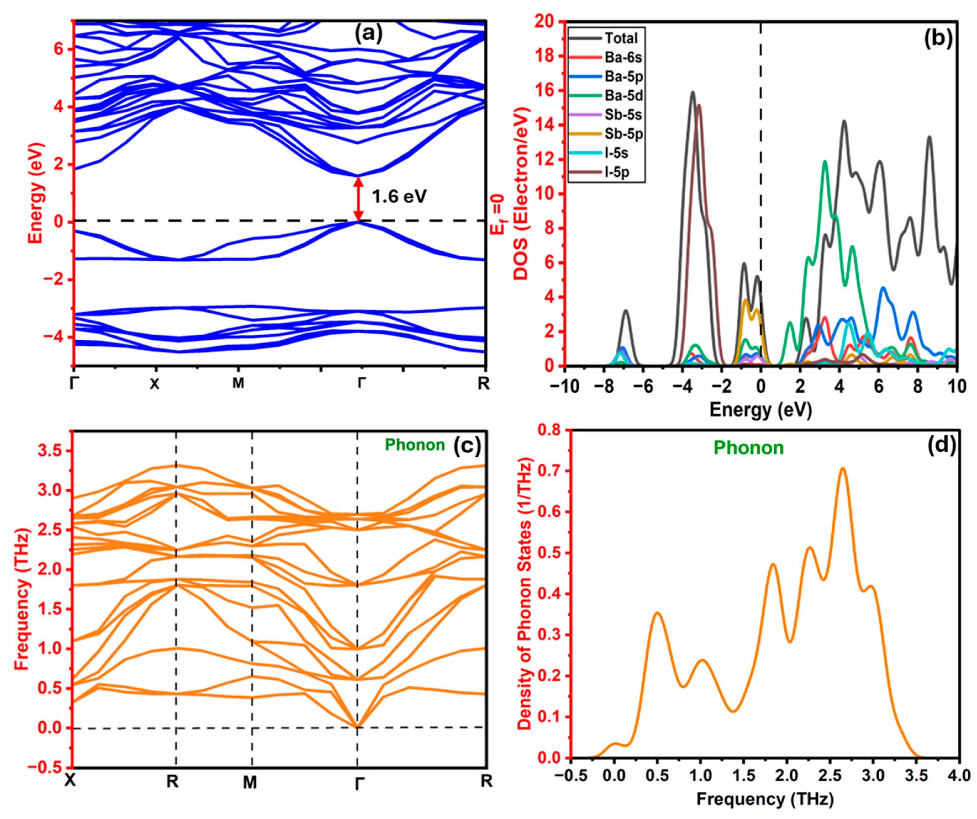 3.1.3. Electronic, DOS, and Phonon Dispersion Characteristics of Ba3Sbl3 Compound