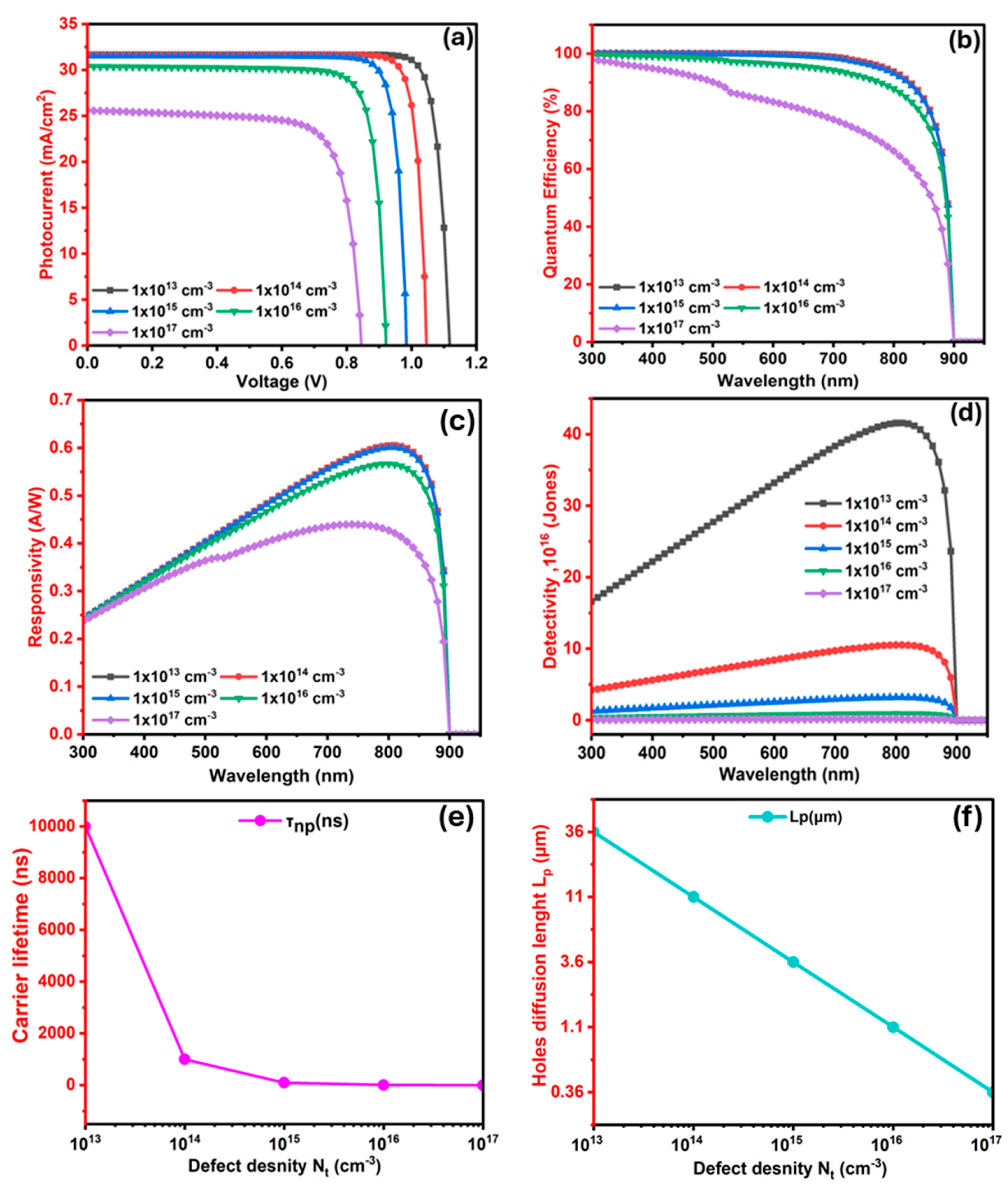 3.2.5. The Influence of Ba3SbI3 (Absorber) Layer Defects (Nt) on the Photodetector