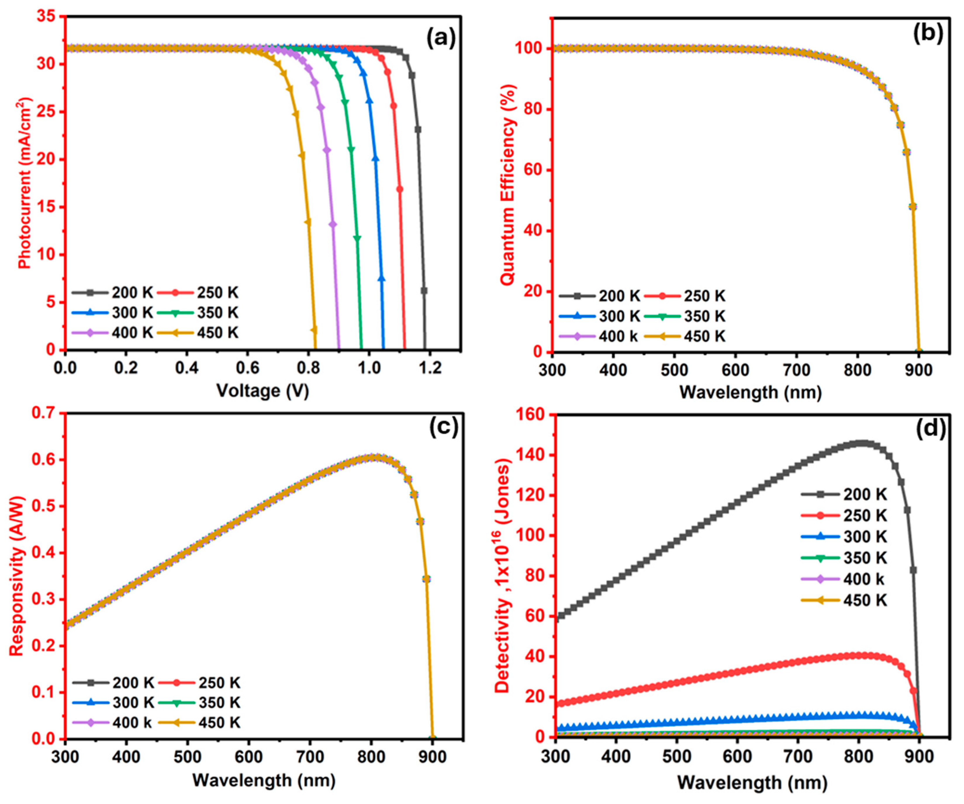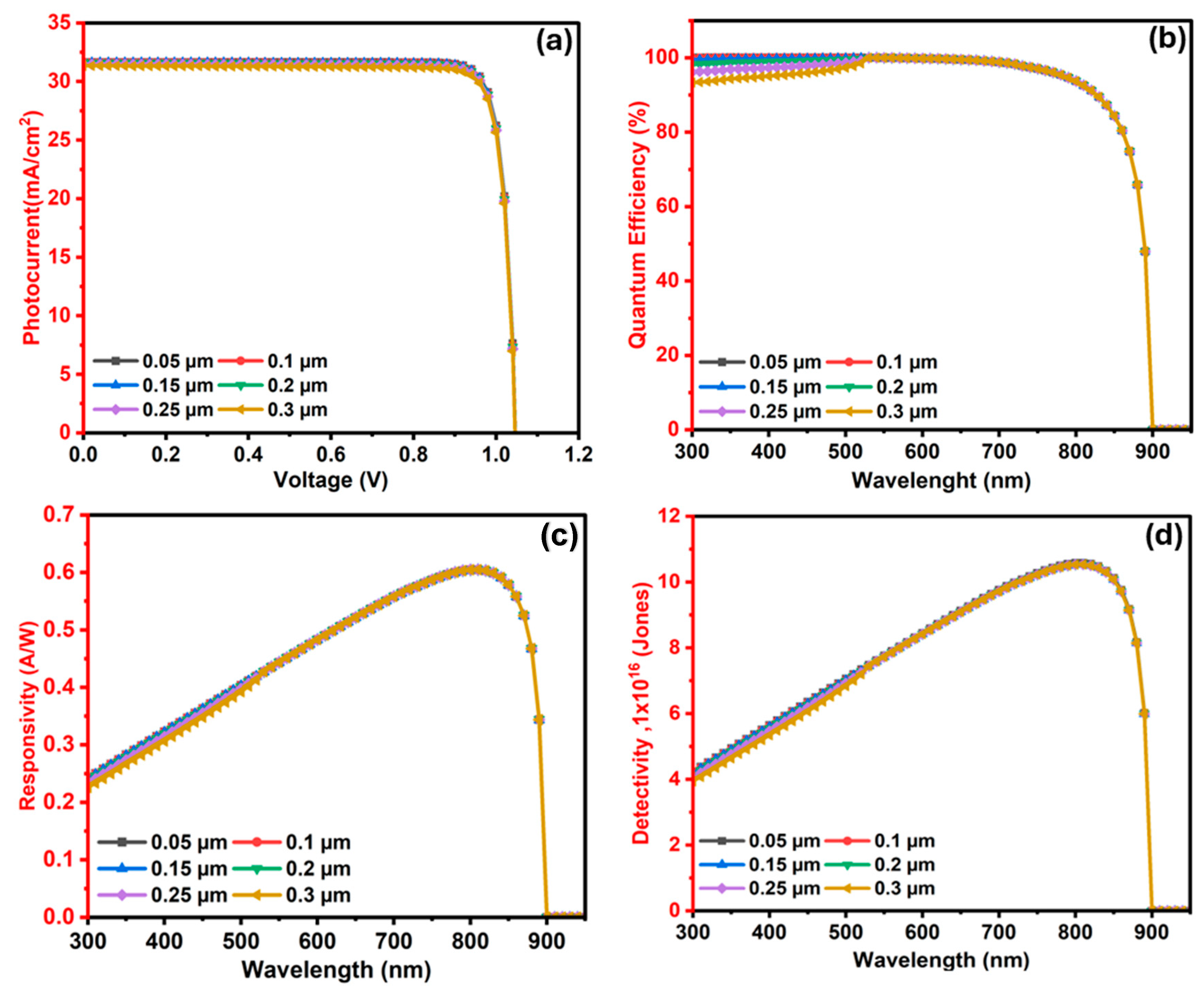 | Structure | Voc | Jsc (mA/cm2) | Wavelength (nm) | Responsivity (A/W) | Detectivity (Jones) |