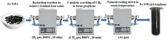 As shown in Figure 2, the as-prepared Fe NWs in a crucible were placed into a horizontal tube furnace, where they were treated under a H2 atmosphere (80 sccm) at 600 °C for 10 min. This step aims to remove a small amount of iron oxide residues in the Fe NWs through a reduction reaction. Subsequently, the H2 gas was stopped and switched to CH4 gas (100 sccm), while the temperature was increased to 800 °C and maintained for 20 min. After the reaction, the CH4 gas flow was halted and replaced with Ar gas as a protective atmosphere at a flow rate of 80 sccm, followed by natural cooling down to room temperature. Finally, Fe NWs@Graphene were obtained. During the preparation process, a Ni-based catalyst was introduced to lower the decomposition temperature of CH4 gas, thereby reducing the adverse effects of high temperature on the structure of the Fe NWs.