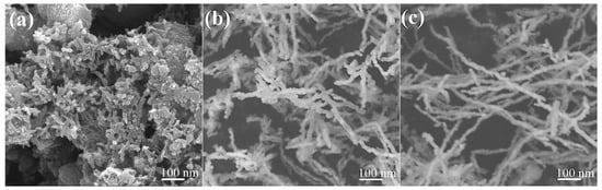 Figure 4 shows the SEM images of the surface morphology of the as-prepared Fe NWs. A comparison between Figure 4a and Figure 4b,c reveals a significant effect of the external magnetic field on the morphology of the Fe NWs. As shown in Figure 4a, the Fe NWs prepared without an external magnetic field are relatively short in size and accompanied by a large amount of irregular mixtures. Figure 4b displays that Fe NWs with a relatively high linear structure were successfully synthesized after a 2-min reaction under an external magnetic field. The Fe NWs reacted for 2 min had average diameters and lengths of ~21 nm and ~210 nm, respectively. Figure 4c further illustrates the morphology of the sample after a 4-min reaction under the applied magnetic field, indicating that as the reaction time increases, so does the length of the resulting Fe NWs: thus, the Fe NWs produced under these conditions exhibited average diameters and lengths of ~24 nm and ~470 nm, therefore resulting in a two-fold increase in the NW aspect ratio, from ~10 to ~20. The reasons for the differences in the morphology of the Fe NWs under the different reaction conditions can be explained as follows: The synthesis of Fe NWs proceeds via reduction, nucleation, growth, and assembly in a heterogeneous mixture of NaBH4 and FeSO4·7H2O solution. Fe2+ is reduced by BH4− to generate elemental Fe, and due to the inherent magnetism of Fe, it undergoes directional migration under the influence of an external magnetic field [32]. Therefore, the formation of Fe NWs is facilitated under magnetic field assistance, and as the reaction time prolongs, the Fe NWs continue to grow, thereby exhibiting a large aspect ratio.