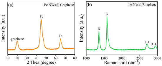 Figure 7 presents the XRD and Raman spectra of the Fe NWs@Graphene, employed for characterizing its crystal phase structure and composition. As shown in Figure 7a, the Fe NWs@Graphene still retain two typical diffraction peaks, attributed to the α-Fe phase [32]. Additionally, a diffraction peak corresponding to graphene appears at 2θ = 19.86° [40,41,42]. According to Bragg’s law, the interlayer spacing of the graphene is calculated to be approximately 4.47 Å (0.447 nm). As shown in Figure 7b, the Fe NWs@Graphene exhibit distinct D and G peaks, which originate from lattice defects of carbon atoms and the in-plane stretching vibrations of sp2 hybridized carbon, respectively, further confirming the presence of graphene. Meanwhile, the appearance of the 2D peak and the D+G peak can also be observed, indicating that the graphene has a multilayer structure [40,41,42]. The XRD and Raman results further indicate the successful preparation of Fe NWs@Graphene materials.