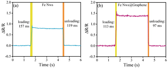 Response speed during loading and unloading under 10% strain: (a) Fe NWs flexible sensor, (b) Fe NWs@Graphene flexible sensor.