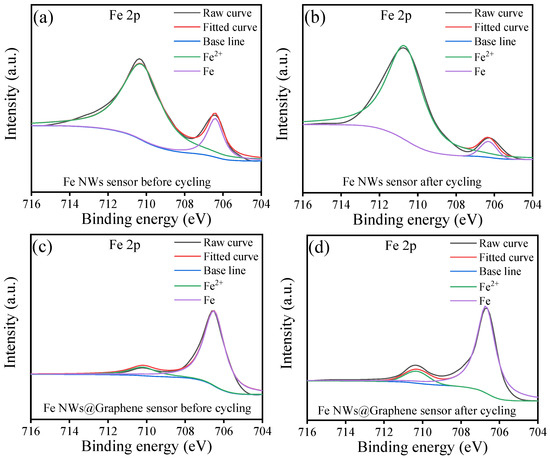 As shown in Figure 11, it can be observed that due to the susceptibility of Fe to oxidation in air, the Fe 2p XPS spectra of the Fe NWs flexible sensors exhibit strong Fe2+ peaks both before and after cycling, while the metallic Fe peaks are relatively weak (Figure 11a,b). In sharp contrast, the Fe NWs @Graphene flexible sensors display strong metallic Fe peaks with weak Fe2+ peaks before and after cycling (Figure 11c,d). This result provides direct evidence that depositing graphene coating on the surface of Fe NWs effectively enhances the oxidation resistance. Furthermore, it can be noted that the Fe2+ peaks of both the Fe NWs and Fe NWs@Graphene sensors become more stronger after cycling, indicating an increased degree of oxidation. This suggests that the performance of the flexible sensors may experience certain degradation after cycling, which is consistent with the results presented in Figure 10.