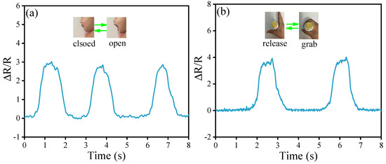 The above experimental results indicate that the as-prepared Fe NWs@Graphene flexible sensors exhibit good sensitivity, a wide detection range, fast response speed, excellent stability, and repeatability, demonstrating significant application potential. To further validate its practical performance, simulated application tests were conducted on the sensor. As shown in Figure 12a,b, the FeNWs@Graphene flexible sensors were attached to the corner of the mouth and the index finger of the volunteer while maintaining mouth closure and finger extension. When the volunteer performed mouth-opening and bottle-grabbing actions, the FeNWs@Graphene flexible sensors correspondingly experienced strain, leading to a change in the resistance signals. Figure 12a,b show that the FeNWs@Graphene flexible sensor successfully captured signals generated by muscle stretching during these movements, with good repeatability. These findings fully demonstrate the excellent sensing performance of the Fe NWs@Graphene flexible sensor with a 3D porous structure, highlighting its broad application prospects in the fields of wearable devices and human motion detection.