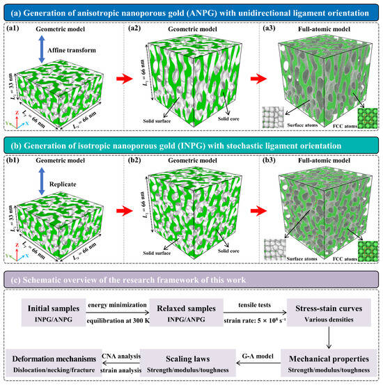 Figure 1 gives the fabrication processes of the full-atomic model of the anisotropic/isotropic NPG with a relative density (ρ) of 0.40. As Figure 1(a1,b1) show, the initial NPG sample is generated by solving the Cahn-Hilliard equation, with the dimensions of 66 nm (Lx) × 66 nm (Ly) × 33 nm (Lz). The dimensions in the x- and y-directions are set to be twice that of the z-direction, such that the subsequent preparation of two types (unidirectional and stochastic ligament orientations) of nanoporous samples is enabled. As Figure 1(a1,a2) illustrate, the NPG sample with initially anisotropic dimensions undergoes an affine transformation along the z-direction, in which the z-coordinates are scaled by a factor of two, resulting in a final structure with identical three-dimensional dimensions of 66 nm (Lx) × 66 nm (Ly) × 66 nm (Lz) (Figure 1(a2)). The transformed material exhibits anisotropic characteristics, with ligaments preferentially aligned along the z-direction (out-of-plane direction). Specifically, the length and thickness of the ligaments in the z-direction are twice those in other directions. Differently, when the initial sample is duplicated once along the z-direction, as denoted in Figure 1(b1,b2), the resulting NPG structure becomes isotropic. In this case, the ligament orientations are random, and their length and width are uniformly distributed in all three directions, indicating isotropic behavior. Note that the structures generated in Figure 1(a2,b2) are solid geometric models. The white regions represent the interface between the solid ligaments and the pores, while the green areas represent the interior of the solid ligaments, with 3D PBCs applied. The geometric model serves as a template to construct the final full-atom model of NPG. The parent material is defined as face-centered cubic (FCC) single-crystal gold with crystal orientations along [001], [010], and [100]. Topological operations are performed on the geometric template to generate the atomic structure by the software ATOMSK Beta 0.13.1 [29] (atoms located outside the surface are deleted to create the surface). In the resulting model, as illustrated in Figure 1(a3,b3), green atoms correspond to the regular FCC lattice, and white atoms represent disordered surface atoms.