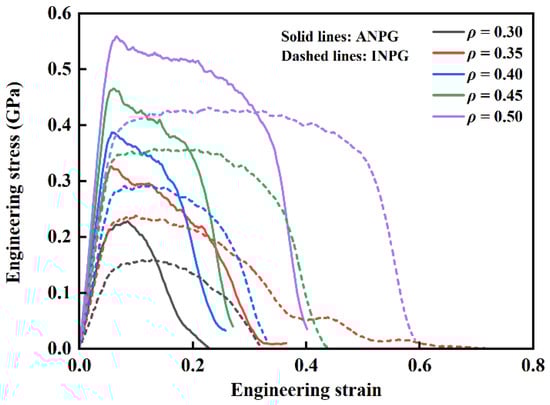 In this subsection, we first discuss the stress-strain responses of INPG and ANPG atomistic samples with varying relative densities under tension. Figure 3 shows the typical uniaxial tensile engineering stress-strain diagram of ANPG and INPG samples with varying relative densities, obtained at 300 K and an engineering strain rate of 5 × 108 s−1. Note that the solid and dashed lines represent the mechanical responses of ANPG and INPG, respectively. Both the ANPG and INPG exhibit tensile deformation characteristic that aligns well with the established mechanical response patterns of traditional nanoporous metallic materials obtained by MD simulations [16,18,38]. The entire stress-strain responses can be divided into three consecutive deformation stages: the initial linear elastic deformation stage, the subsequent yielding and plastic flow plateau stage, and the final rapid crack propagation and failure stage. In the first linear elastic regime, the applied stress demonstrates a rapid, linearly proportional increase with the accumulating engineering tensile strain, following the classic Hooke’s law. Upon reaching the critical yield point, a noticeable transition occurs where further strain accumulation no longer produces a corresponding stress increase; instead, the stress level becomes suppressed, forming a distinct flow plateau where the stress remains nearly constant or undergoes a gradual, moderate decrease while strain continues to accumulate significantly. The final stage commences when localized ligament fracture initiates microcrack formation, creating stress concentration sites that drive rapid crack propagation through the whole structure, ultimately leading to an abrupt, dramatic stress drop that culminates in complete structural failure.