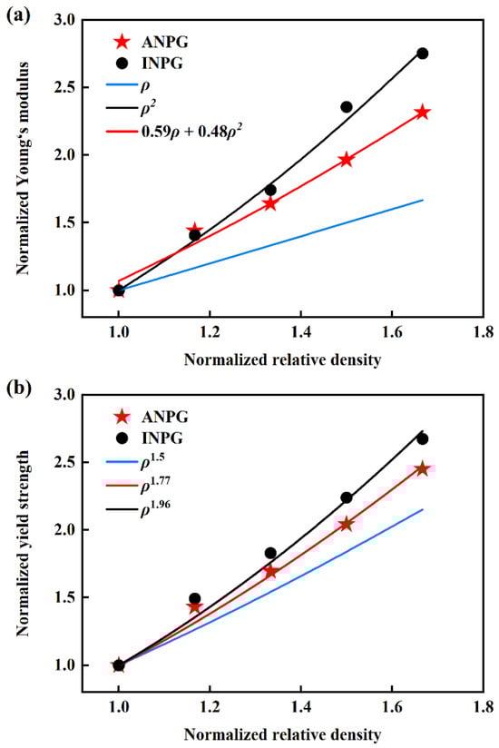, respectively. Notably, the smaller exponent observed in ANPG indicates that its yield strength exhibits relatively less degradation at lower relative densities compared to conventional NPG. This phenomenon originates from the inherent microstructural features in the ANPG. Herein, the affine transformation is used in generating ANPG, which elongates ligaments along the out-of-plane direction (Figure 2) and thus improves ligament connectivity effectively, particularly at low densities. While stochastic INPG structures experience a rapid loss of load-bearing paths as density decreases due to the decreased ligament connectivity [12,15], the solid ligament network in ANPG preserves more continuous stress transmission channels. Consequently, the yield strength of ANPG degrades more gracefully under density reduction, making it particularly advantageous for lightweight applications where structural integrity must be maintained across varying porosity levels.