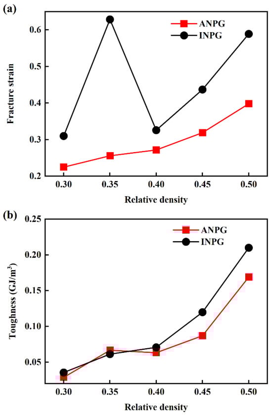 (a) Fracture strain and (b) toughness as a function of relative density for the tested ANPG and INPG.