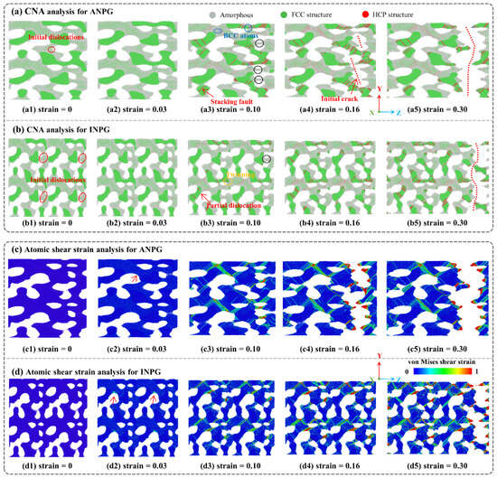 is the strain tensor. The von Mises shear strain is an important tool to study local deformation [54]. As shown in Figure 6c,d, we observe in real time the evolution of atomic shear strain during tension deformation. In the absence of applied strain, no internal deformation is detected. When the strain reached 0.03, the two structures remain in the elastic deformation regime, with only minimal atomic strain localized at ligament surfaces or regions of stress concentration, as indicated by the red arrows in Figure 6(c2,d2). This localized strain distribution corresponds to the initial stress redistribution within the ligament network before global yielding, demonstrating how elastic deformation is accommodated through localized atomic displacements in these nanostructured materials. At the strain of 0.10, both the INPG and ANPG structures exhibit extensive plastic deformation, as clearly illustrated in Figure 6(c3,d3). In the ANPG, severe shear strain localization develops. Numerous localized shear deformation zones emerge, predominantly concentrated along active slip planes and within ligament necking regions. Subsequent rapid necking of these critically strained ligaments in ANPG intensifies the deformation concentration in adjacent regions, ultimately triggering failure reminiscent of crack propagation. Conversely, the INPG demonstrates fundamentally distinct strain distribution characteristics. A more homogeneous redistribution of shear strains occurs across a broader population of ligaments throughout the structural network at 0.10 strain. This deformation mechanism effectively suppresses localized failure initiation and enhances global ductility. No remarkable ligament necking is observed at 0.10 strain in the INPG sample (Figure 6(d3)). At 0.16 strain, extensive ligament fracture has already occurred in ANPG, with shear deformation zones concentrating around these fracture sites (Figure 6(c4)). In contrast, INPG exhibits no ligament fracture under equivalent strain conditions (Figure 6(d4)). As deformation progresses, the continuing necking and eventual fracture of ligaments generate intense plastic strain accumulation in these critical areas, visually represented by the red-colored atoms in the strain mapping of Figure 6(c5,d5). The deformation analysis in Figure 6 reveals that plastic deformation in ANPG and INPG is not confined to eventual fracture surfaces alone. Significant plastic strain distribution occurs extensively in regions far from the primary fracture path, demonstrating that these materials undergo substantial plastic redistribution before final failure. This widespread plastic activity enables the structure to fail through a ductile fracture mechanism rather than experiencing abrupt brittle failure, highlighting the enhanced damage tolerance inherent to nanoscale porous metallic materials. It is noteworthy from Figure 6 that both ANPG and INPG exhibit a consistent ligament fracture pattern characterized primarily by axial rupture along the tensile direction, with the final fracture surfaces oriented approximately perpendicular to the applied tensile axis. This phenomenon can be attributed to the structural realignment mechanism during tensile deformation, where ligaments undergo progressive reorientation toward the loading direction. As the strain increases, many initially random or preferentially aligned ligament structures tend to align with the tensile axis, creating favorable conditions for crack propagation along the reoriented ligament pathways. The strain localization can serve as a predictor of where the ligaments will eventually rupture. The resulting fracture morphology demonstrates how the inherent anisotropy of nanoporous structures governs the damage evolution process, with the final fracture plane developing normal to the principal stress direction regardless of the initial ligament orientation.
