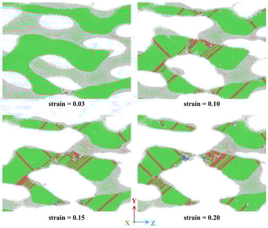 Local microstructural change in selected regions of ANPG with a relative density of 0.4 during tensile deformation. Atoms are color-coded based on their lattice types: green represents FCC-structured Au atoms, white corresponds to amorphous atoms (surface atoms), red indicates HCP-structured atoms, and blue denotes BCC-structured atoms.