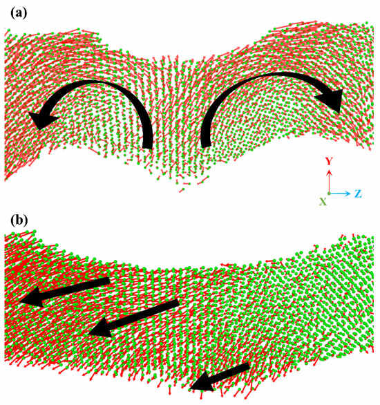 Local atomic displacement vector distribution within a representative ligament of (a) INPG and (b) ANPG at a tensile strain of 0.03 (elastic deformation stage). The red arrows indicate the displacement vector of each atom relative to its position in the undeformed state. The black arrows illustrate the motion trends of large atomic clusters.