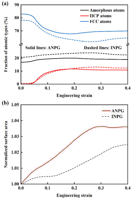 To quantitatively investigate the plastic deformation evolution in INPG and ANPG samples under tensile loading, we analyze the variations in different atomic types in both INPG and ANPG structures with a relative density of 0.40, as illustrated in Figure 9a. The black, blue, and red curves represent the percentages of amorphous, FCC, and HCP-structured atoms, respectively, with solid and dashed lines corresponding to ANPG and INPG. In the small-strain regime (below ~0.045), the fraction of HCP atoms remains negligible while the FCC percentage remains nearly constant, indicating pure elastic deformation without plastic activities. Notably, the initial FCC atom percentage in INPG is lower than in ANPG, which can be attributed to the longer and thicker ligaments aligned along the tensile direction in ANPG, resulting in a greater proportion of atoms located in the ligament interior rather than on the surfaces. Upon yielding (at ~0.045 strain), the HCP fraction increases pronouncedly, accompanied by a decrease in FCC atoms, signaling the onset of plastic deformation mechanisms including dislocation glide, stacking fault formation, and phase transformation. As strain increases, the fraction of HCP atoms progressively rises while the FCC atomic population correspondingly decreases. This increase in the fraction of HCP atoms implies the high toughness, which represents the enhancement of the energy absorption capacity during tensile deformation [16]. Beyond approximately 0.15 strain, the HCP atom population stabilizes, suggesting exhaustion of available dislocation sources and saturation of stacking fault generation. Subsequent deformation proceeds mainly through progressive ligament necking and fracture. While INPG and ANPG exhibit similar HCP fractions at strains below ~0.20, indicating comparable plastic deformation behavior, significant divergence emerges at higher strains. The higher HCP content in INPG beyond 0.20 strain reflects more extensive dislocation-mediated plasticity and stacking fault activity, whereas ANPG undergoes predominantly ligament necking and fracture, consistent with its earlier failure observed in Figure 3.
