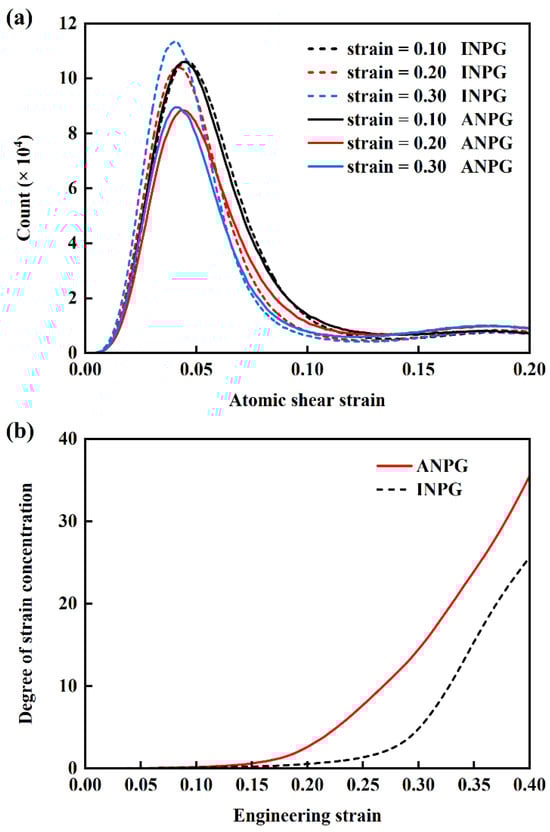 The statistical distribution of shear strain of individual atoms during plastic deformation is quantitatively characterized. Figure 10a presents the atomic shear strain distributions for both INPG and ANPG at a relative density of 0.40 under applied strains of 0.10, 0.15, and 0.20, with solid and dashed lines representing ANPG and INPG, respectively. At the relatively smaller global plastic strain of 0.10, despite the onset of plastic deformation, the shear strain distributions of ANPG and INPG remain nearly identical, as indicated by the overlapping black solid and dashed lines. However, as strain increases to 0.15 and 0.20, discernible differences emerge between the two structures. Particularly at 0.20 strain, ANPG exhibits a noticeably lower distribution peak and a broader strain spread compared to INPG. This indicates that in INPG, a larger proportion of atoms experience shear strains concentrated near the peak value, reflecting more homogeneous deformation, whereas ANPG develops a more heterogeneous strain distribution with increasing plastic deformation. To quantitatively investigate the strain localization extent, we calculate the deformation concentration degree using the formula: