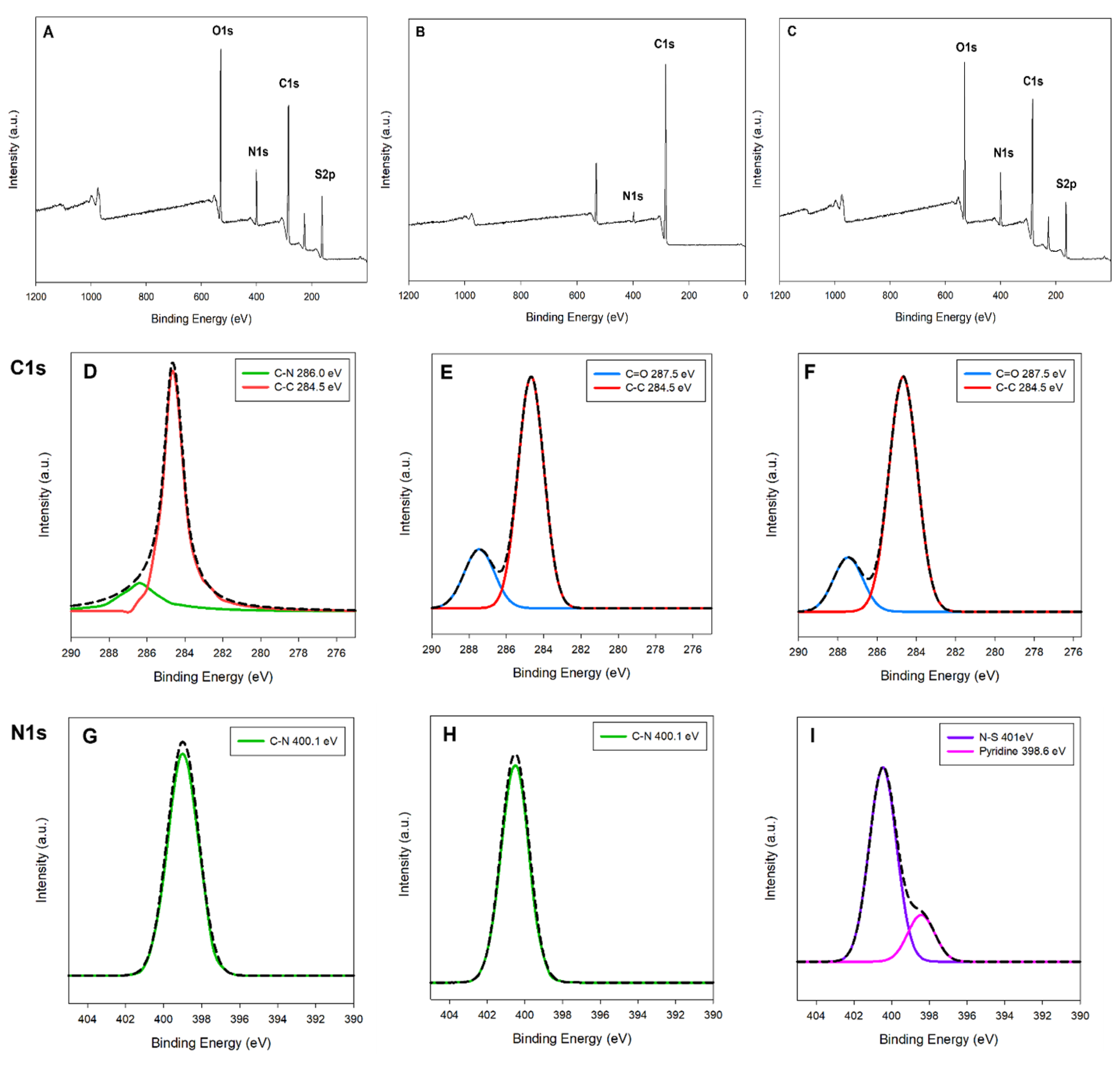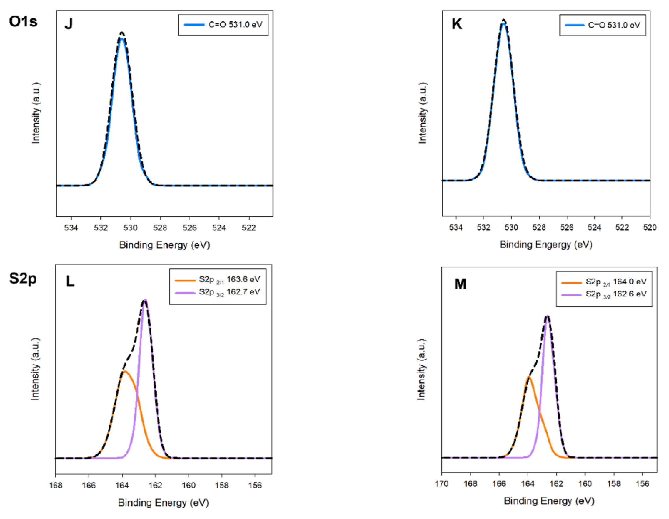 X-ray Photoelectron Spectroscopy (XPS) analysis of the synthesized CDOM (Carbon Dot from o-Phenylenediamine and Methionine) was performed (Figure 2). The resultant XPS spectra revealed changes in elemental composition and chemical bonding states when compared CDOM to its precursors, o-phenylenediamine and Methionine. Through the survey scanning four typical C, N, O, S peaks were observed (Figure 2A–C). According to the deconvolution based on high-resolution XPS spectra, C1s spectrum of CDOM was observed at 287.5 eV, a peak corresponding to the carbonyl group (C=O) (Figure 2E,F). This indicates that the methionine carboxyl group remained intact even after the synthesis process. In contrast, the C-N bond peak at 286.0 eV (Figure 2D), which was previously observed in the precursor methionine, was not detected in the CDOM spectrum, suggesting that the reaction predominantly occurred at the amino (-NH2) residues of o-phenylenediamine. For N1s spectrum, the C-N bond peaks previously identified in the 399–400 eV range for o-phenylenediamine and methionine (Figure 2G,H) were no longer observed in CDOM. Instead, a new N-S bond peak was detected at 401 eV, and a binding energy peak at 398.6 eV, which corresponding to the pyridine-type nitrogen structure, was identified (Figure 2I). These changes demonstrate that the chemical environment of nitrogen atoms within CDOM was restructured into new forms different from those in the precursors. The O1s spectrum showed similar results in both methionine and CDOM (Figure 2J,K), indicating that the methionine carboxyl group was stably preserved after CDOM synthesis. The S2p spectrum analysis revealed particularly significant bonding changes. In the S2p spectrum of methionine (Figure 2L), a peak corresponding to the C-S bond with a spin-orbit splitting distance of approximately 0.9 eV was observed. In contrast, the S2p spectrum of CDOM showed a conversion to an N-S bond form, with the spin-orbit splitting distance increasing to 1.4 eV (Figure 2M). This provides evidence that the sulfur (S) atom formed new chemical bonds with an atom other than carbon (C), and when compared with FTIR results, it appears that N-S bonds were newly generated.
