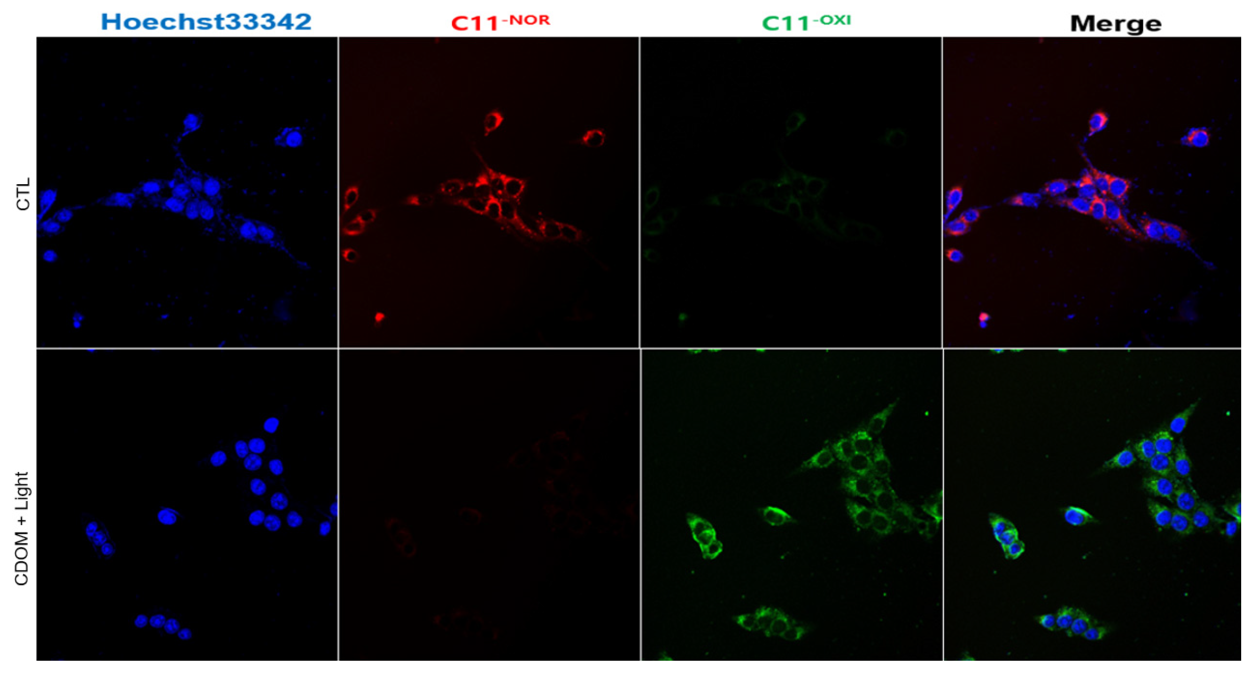 Figure 9. Intracellular lipid peroxidation (LPO) accumulation in HSC3 cells observed using the C11-BODIPY581/591 dye. The control cells exhibited red fluorescence (no CDOM, but with light irradiation), whereas cells treated with CDOM and light irradiation exhibited green fluorescence, indicating the accumulation of intracellular LPO.
