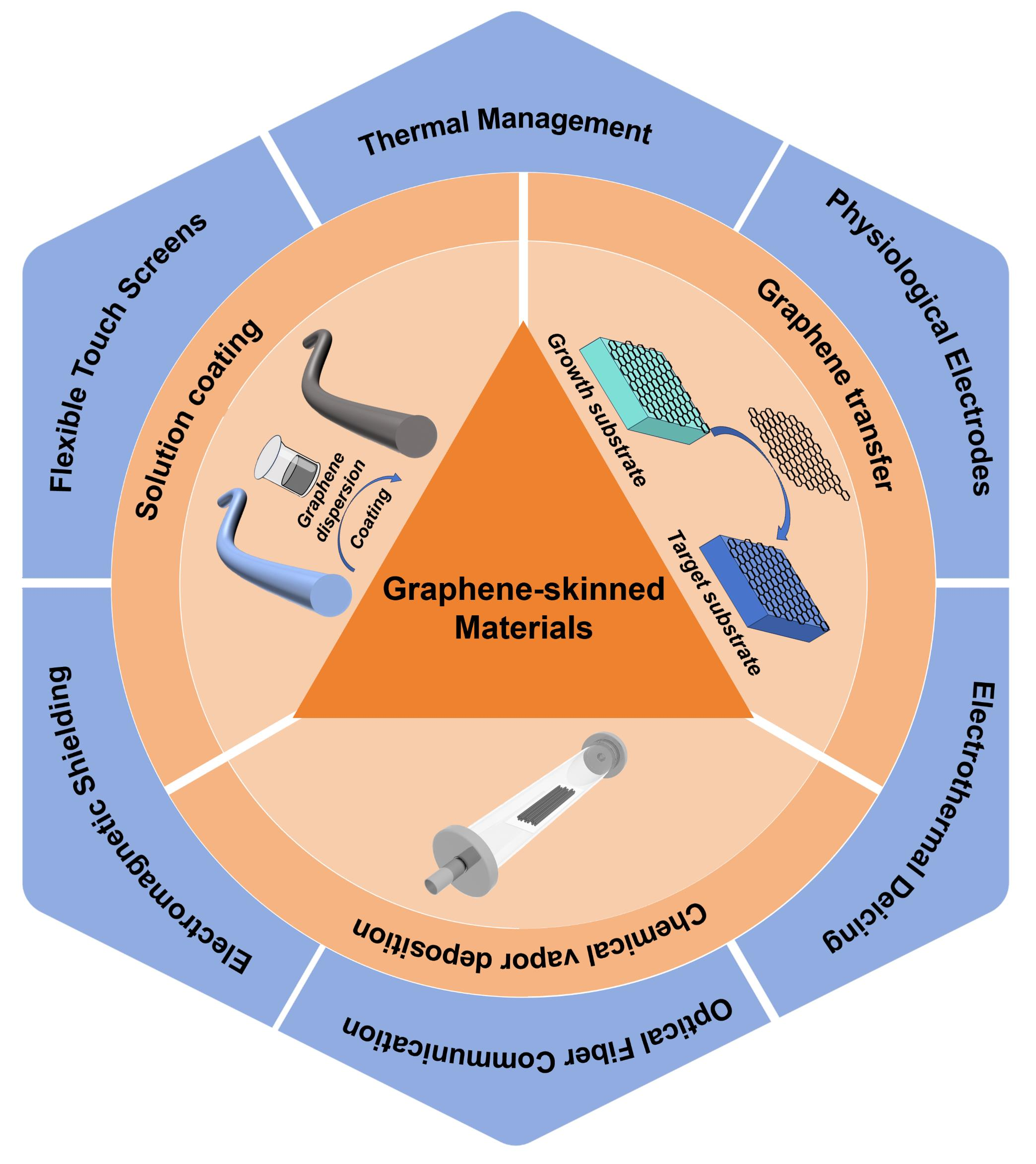 Graphene-skinned materials can be viewed as a unique subclass within the family of graphene-based hybrid architectures. Unlike composites or heterostructures that typically rely on dispersed graphene fillers or laminated assemblies, graphene-skinned materials feature an atomically continuous coating directly bonded to the substrate. This configuration ensures efficient interfacial coupling and defect-free integration, thereby maximizing the utilization of graphene’s intrinsic conductivity, thermal transport, and mechanical strength within a macroscopic framework.