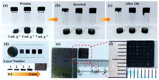 (a–c) Photographs of printable inks with different solvent contents after various inversion times; (d) optical images of 3D-printed battery electrodes with different printing layers; (e,f) dimensional view and magnified image of the printed electrodes.