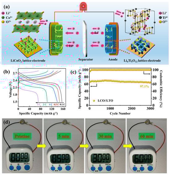 The 3D printed LCO//LTO full cell of (a) Schematic illustration of the working principle; (b) GCD curves at different current rates; (c) Cycling performance over 3000 cycles; and (d) Demonstration of the stopwatch powered by the 3D-printed full battery.