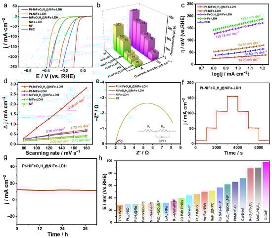 Electrochemical evaluation of HER performance: (a) LSV profiles (with 95% iR-corrected), (b) comparison of overpotentials for the synthesized catalysts at 10 and 100 mA·cm−2, (c) Tafel slop, (d) electrochemical surface area, (e) EIS spectra, (f) multi-step chronopotentiometric measurements, (g) long-term stability evaluation of Pt-NiFeOxHy@NiFe-LDH via chronopotentiometry, (h) comparison of the overpotentials measured at 10 mA·cm−2 with benchmark catalysts reported in 1 M KOH clearly indicates the superior HER performance of Pt-NiFeOxHy@NiFe-LDH.