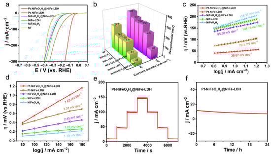 Comprehensive characterization of the HER performance of Pt-NiFeOxHy@NiFe-LDH in 1 M KOH seawater, including (a) polarization curves (with 95% iR-corrected), (b) comparison of overpotentials at 10 and 100 mA·cm−2, (c) Tafel plots, (d) determination of the electrochemically active surface area, (e) stepwise chronopotentiometric profiles, and (f) long-term durability evaluation.