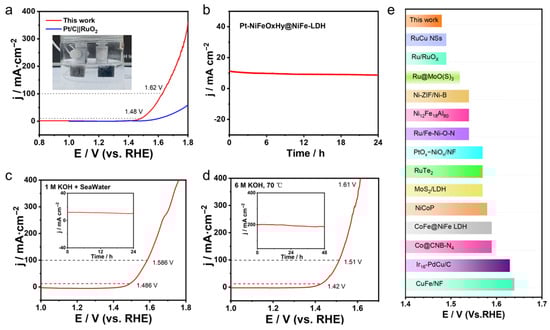 (a) LSV curves of Pt-NiFeOxHy@NiFe-LDH||Pt-NiFeOxHy@NiFe-LDH for overall water splitting (with 95% iR-corrected) (inset: photograph of the two-electrode configuration), (b) Chronoamperometry evaluation conducted in 1 M KOH electrolyte, (c) LSV profiles recorded for overall water splitting in a 1 M KOH-seawater electrolyte (with 95% iR-corrected), (d) LSV profiles measured in 6 M KOH at 70 °C (with 95% iR-corrected), the inset in (c,d) shows the stability assessment of overall water-splitting performance, (e) Comparison of overpotentials with data from recent literature.