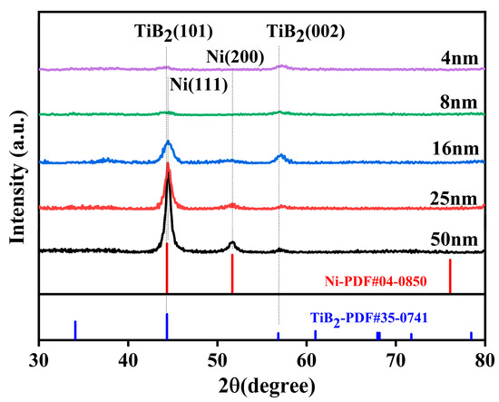 XRD analysis of TiB2-Ni multilayer films with varying Ni layer thicknesses is presented in Figure 3. All samples exhibit similar diffraction peaks, featuring three prominent peaks at approximately 44.45°, 51.85°, and 57°. The most intense peak near 44.45° arises from the overlapping contributions of the TiB2 (101) and Ni (111) reflections. This assignment is consistent with the reference patterns for TiB2 (PDF#35-0741) and Ni (PDF#04-0850), confirming that both phases possess a polycrystalline nature. The additional peaks at 51.8° and 57° are attributed to the Ni (200) and TiB2 (002) crystal planes, respectively. With increasing nickel layer thickness, the contribution from the nickel (111) crystal plane becomes increasingly dominant around 44.45°. Concurrently, the diffraction peak corresponding to Ni (200) grows more pronounced as the Ni layer thickness increases. These observations indicate that during the growth of the multilayer film, the Ni layer develops a strong (111) fiber texture, and this preferred orientation becomes increasingly pronounced with greater layer thickness. As the thickness of the Ni layer increased from 4 nm to 50 nm, the full width at half maximum of the Ni (111) diffraction peak significantly decreased. This indicated that the grain size of the Ni layer significantly increases with the increase in layer thickness. The intensity and width of the TiB2 (002) diffraction peak did not undergo significant changes, suggesting that the crystal structure of the TiB2 layer is less affected by the change in the thickness of the Ni layer.