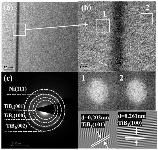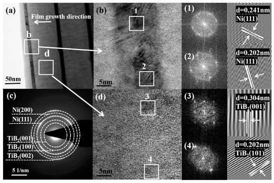 When the thickness of the Ni layer increased to 16 nm, the evolution of its microstructure became more pronounced, as given in Figure 5. From Figure 5a, it can be seen that the film forms a clear layer structure, where the thicker one is the TiB2 layer and the thinner one is the Ni layer, and the interlayer interface between the TiB2 layer and the Ni layer is very clear. The high-resolution image of Figure 5b and its Fourier transform spectrum clearly identify the Ni (111) crystal plane, indicating that the Ni layer in this area has good crystallinity. The corresponding SAED pattern of Figure 5c shows that the diffraction pattern at the interface of Ni and TiB2 layers. It is obvious that the TiB2-Ni multilayer coating is a polycrystalline structure. The SAED patterns show distinct crystal diffraction rings corresponding to Ni (111), Ni (200), TiB2 (001), TiB2 (100), and TiB2 (002). This result is consistent with the above XRD analysis. Figure 5d shows a local enlargement of the TiB2 layer, and the electron diffraction patterns obtained by Fourier transform of the regions 1 and 2 in Figure 5d show that this region exhibits a unique crystal structure, and the lattice distances of the TiB2 (001) and (101) planes are about 0.304 nm and 0.202 nm, respectively. The clear detection of the Ni (200) ring here, despite its weak signature in the bulk XRD data (Figure 3), confirms the presence of grains with this orientation. Its lower intensity in XRD is consistent with the strong (111) preferred growth texture of the Ni layers, as discussed earlier.