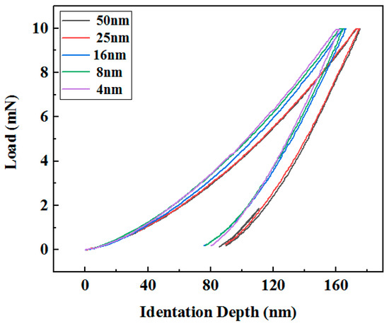 Figure 8 presents the load-indentation depth curves for the multilayer films with different Ni layer thicknesses. These curves are fundamental for understanding the evolution of deformation behavior. A clear systematic shift in the curve morphology is observed. With increasing Ni layer thickness, the hysteresis loop enlarges and the residual indentation depth increases. This provides direct visual evidence of a transition from a more elastic recovery behavior (in films with thin Ni layers) to a more pronounced plastic deformation and energy dissipation character (in films with thick Ni layers).