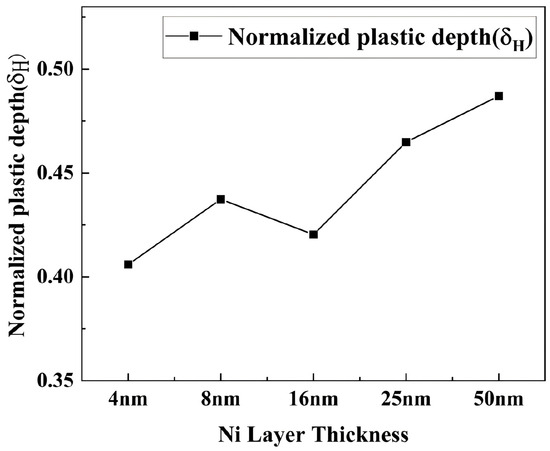 Normalized plastic depth values (δH) for multilayers with different Ni layer thicknesses.