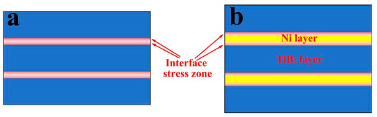 The schematic diagram of the distribution of interface stress zones in TiB2-Ni multilayer films with different Ni layer thicknesses; (a) thin nickel films; (b) thick nickel fims.