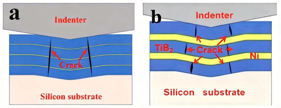 The schematic diagram of deformation of TiB2-Ni multilayer films with different Ni layer thicknesses; (a) thin nickel films; (b) thick nickel fil.