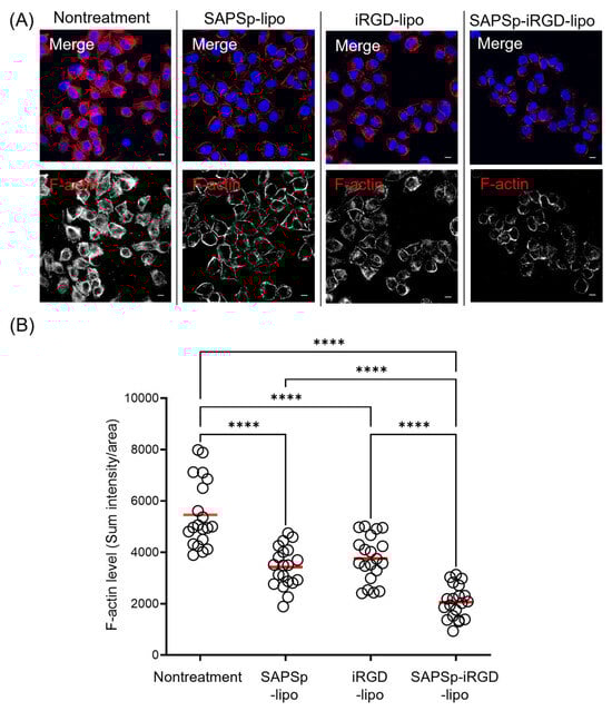 Actin depolymerization induced by SAPSp-iRGD in monolayered cells. A375 cells were exposed to liposomes for 1 h, followed by F-actin staining and observation using CLSM. (A) Representative fluorescence images. Blue: nuclei (DAPI); red: F-actin (rhodamine-phalloidin). Scale bar = 10 µm. (B) Semi-quantitative analysis of F-actin fluorescence intensity per cell. Each circle represents the fluorescence intensity of an individual cell, and the red bar indicates the mean value. n = 20, **** p < 0.0001.