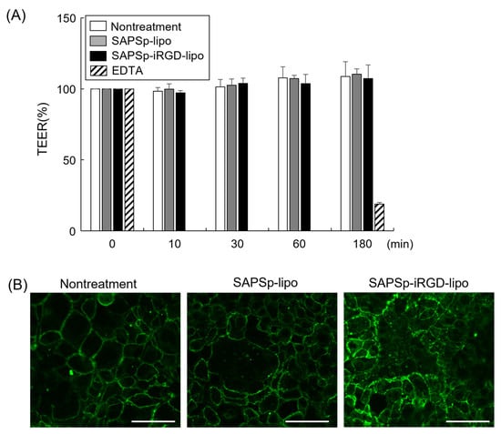 Caco-2 cells were seeded onto 24-well cell culture inserts at a density of 6 × 104 cells/insert and cultured with Caco-2 Monolayer Formation Medium (Oriental Yeast Co., Ltd., Tokyo, Japan). The culture medium was replaced every other day until the transepithelial electrical resistance (TEER) exceeded 500 Ω/cm2, indicating the formation of a tight monolayer. Subsequently, SAPSp-iRGD-lipo was added to the apical side of the monolayers, and TEER values were measured at 0, 10, 30, 60, and 180 min using a Millicell® ERS-2 Volt-Ohm Meter (Merck Millipore, Darmstadt, Germany). As a positive control, EDTA treatment was used to induce tight junction disruption.
