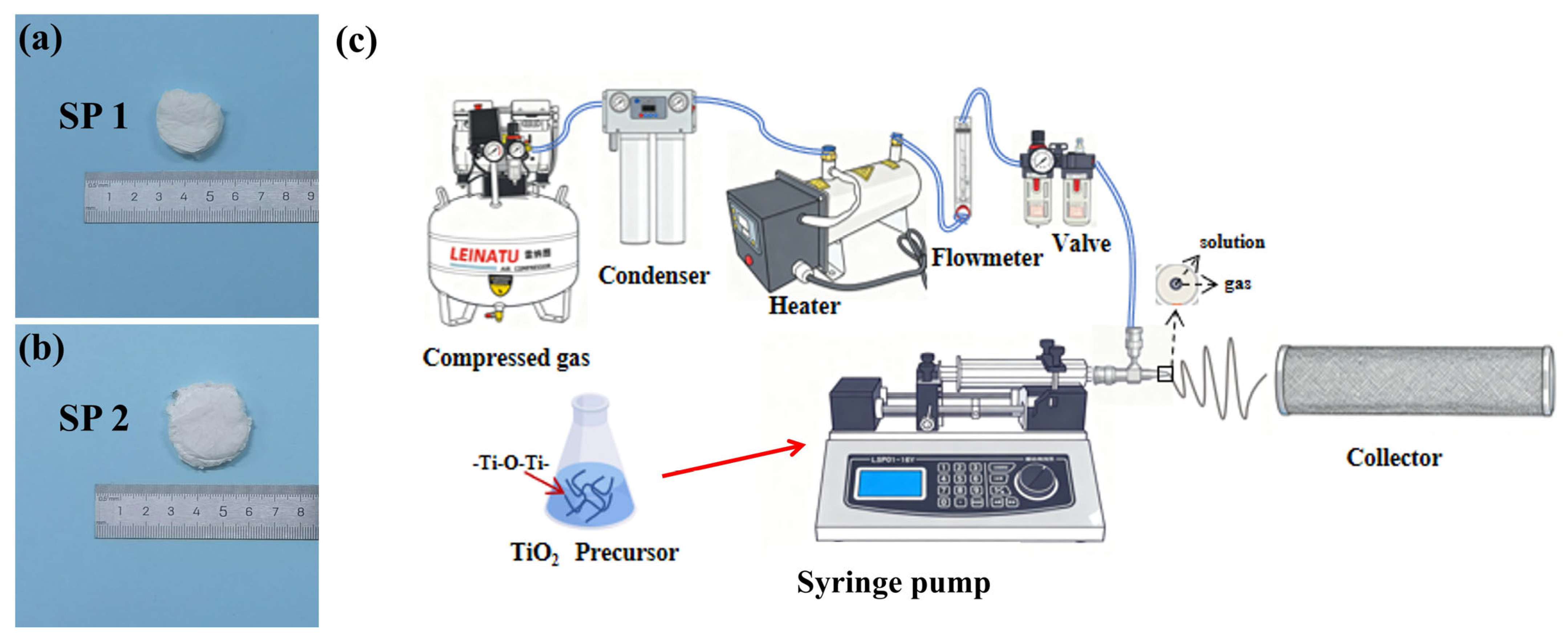 Figure 1. (a) Commercial polypropylene nanofiber; (b) laboratory-synthesized TiO2 nanofiber; (c) schematic of the blow spinning method.