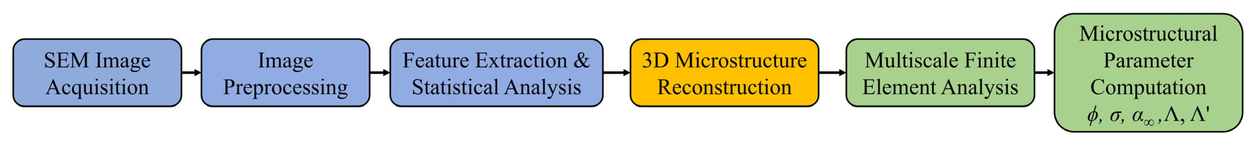Before proceeding, the limitations of the MFEA model should be noted. The current model assumes idealized cylindrical fibers without considering curvature or surface roughness, therefore slightly underestimating local flow resistance. In addition, the Representative Volume Element (RVE) used in the simulation is limited in size due to computational cost, and may not fully capture the long-range connectivity and orientation distribution of fibers in real samples. Moreover, potential sorption effects between the fiber surfaces and air molecules are not yet included in the present model, which may slightly influence the acoustic prediction. Furthermore, fiber bundling could locally alter pore connectivity and flow channels, potentially introducing deviations in the calculated microstructural parameters. These simplifications could lead to deviations when extrapolating microscopic parameters to macroscopic acoustic behavior. A schematic workflow illustrating the process from SEM image acquisition to microstructural parameter calculation is provided in Figure 5 for clarity.