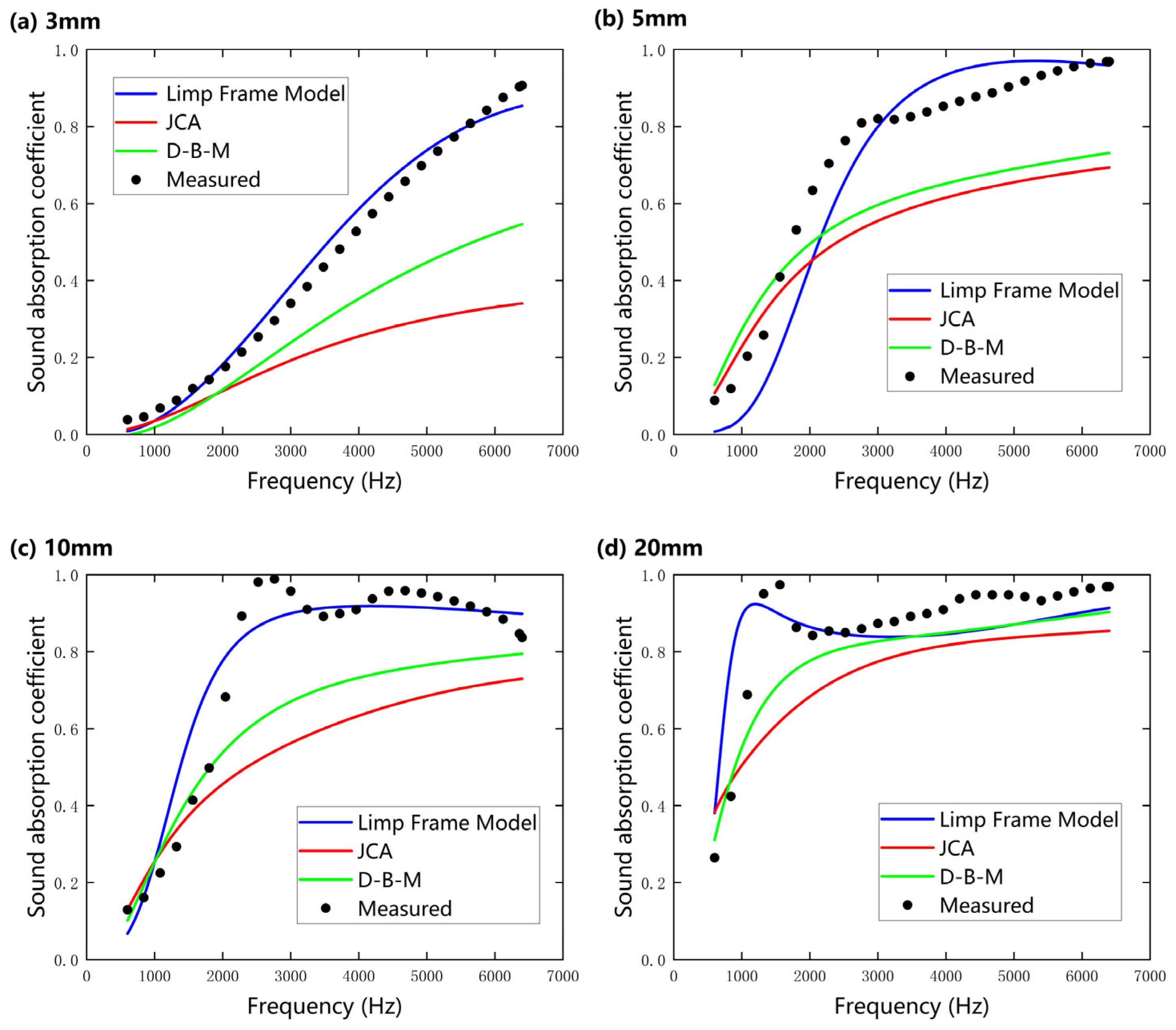 Figure 9. A comparison of the normal-incidence sound absorption coefficients of nanofibers predicted using the Delany–Bazley–Miki (D–B–M), Johnson–Champoux–Allard (JCA), and Limp Frame Models under slip boundary condition, compared with experimental measurements at different sample thicknesses (SP 1): (a) 3 mm; (b) 5 mm; (c) 10 mm; (d) 20 mm.