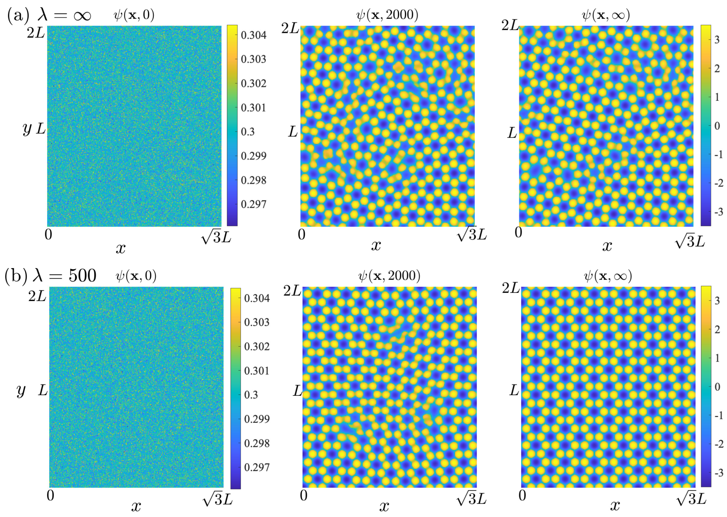 In the numerical simulations, we first test the growth of graphene phases without the bottom-layer potential by choosing parameters corresponding to the solid region of the phase-field, i.e., ensuring the periodicity for each side of the rectangular domain and initializing the system with Gaussian noise. The results agree with [