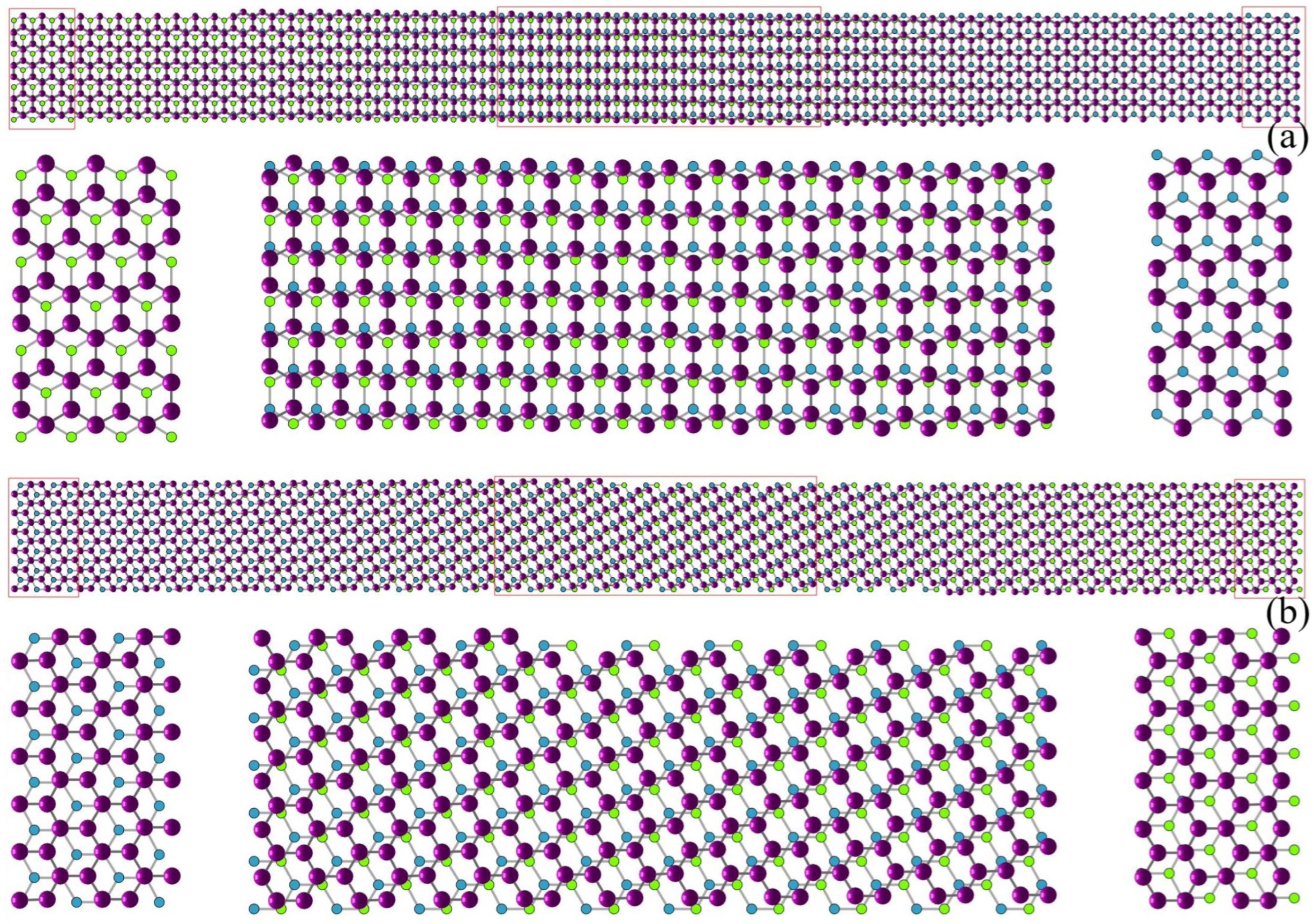 38]. Then, we test the case of a long, narrow ribbon domain. The initial condition consists of four parts, continuous AB and BA regions each of nearly 50% of the entire domain, respectively, and two narrow transitions between each of them is set to be a constant with small Gaussian perturbation. We find four transition types, depending on the angle between the transition region and the shifting direction, 0°, 30°, 60°, and 90°. By comparing with the simulation results from atomistic methods [