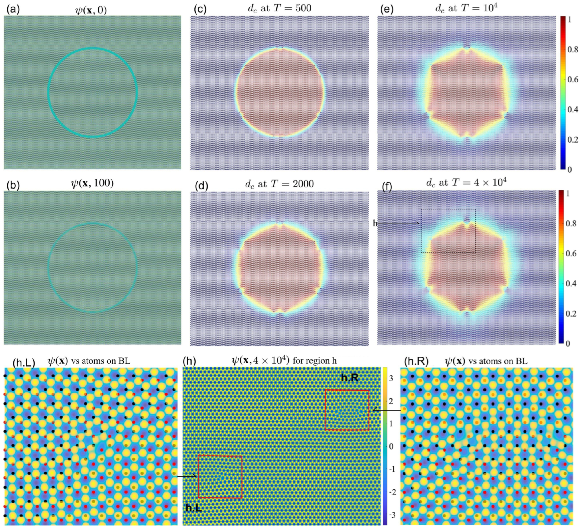 40], we quantify the strength of the bottom-layer potential by the width of the transition region for each type of transition. Finally, we test the case of a circular AB vs BA stacking. With constant transition region, the center part (even a relatively small one) may evolve to a triangular or hexagonal shape with at least one 5–7 defective ring on each vertex. On the other hand, with uniformly smooth transition from AB to BA, the area of the center part will shrink at a constant speed (even for a relatively large disk).
