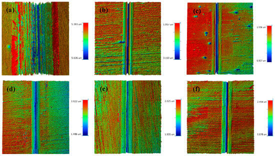 The dry friction 3D profiles of HSLA100 substrate, S1 to S5 are (a–f).