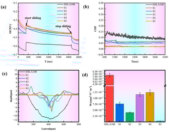 Figure 9b illustrates the COF variations for HSLA100 substrate and DLC coating throughout tribocorrosion, with the HSLA100 COF declining from 0.15 initially to approximately 0.1, which has a certain lubricating effect of corrosion products and debris produced during the tribocorrosion process. And the COF of the coated samples are all stabilized between 0.01 and 0.06. The lowest friction coefficients of S1 and S5 were around 0.01, and the friction coefficients of S2 and S3 were around 0.06. This is due to the different friction characteristics of the a-C:H layer and the a-C layer itself in the solution, and the a-C layer has a better wettability in the solution, which makes the coating itself more lubricated in corrosive solutions []. Furthermore, it is noteworthy that passivating the dangling bonds of the a-C film is achievable. The solution environment contains a high concentration of chemically active molecules (e.g., water and oxygen), which passivate the dangling bonds on the contact surface. The friction coefficient is reduced by the weakening of the adhesion of the friction substitute due to the deactivation of the dangling bonds, which also results in good wear resistance [,]. S1 exhibits low surface energy, resulting in strong hydrophobicity. In solution, it readily forms a stable “liquid film lubrication layer,” reducing direct solid-solid contact and further lowering the coefficient of friction. S2/S3 possess higher surface energy due to C-H bonds, enhancing hydrophilicity. This causes the liquid film to rupture easily, increasing the probability of solid-solid contact. Even with higher hardness, it struggles to counteract the effects of adhesive friction, leading to a relatively high coefficient of friction.