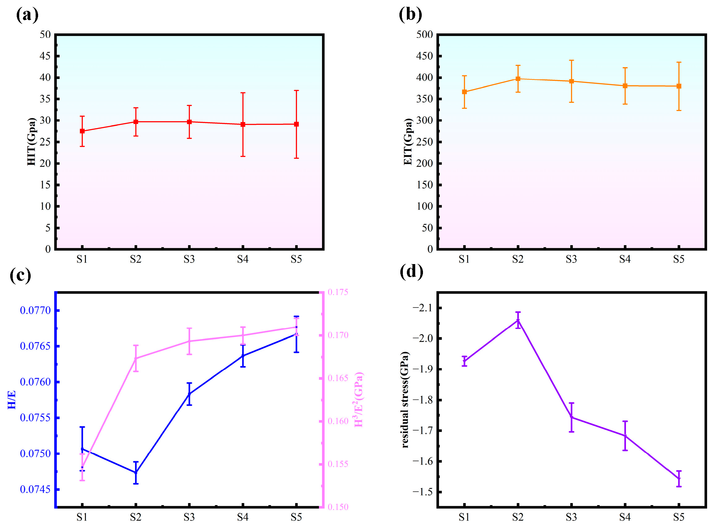 - Introducing C2H2 during arc-ion deposition increased the sp3 fraction, yielding harder and more corrosion-resistant DLC layers. The ten-period multilayer (S5) achieved the highest H/E (0.0767) and H3/E2 (0.171), evidencing the optimal hardness–toughness (elastic recovery–fracture resistance) balance.