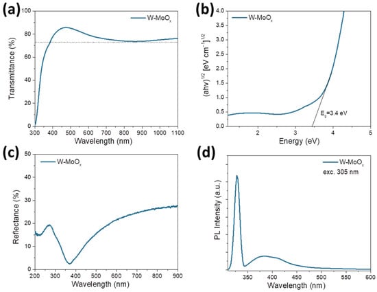 (a) Transmittance spectrum, (b) Tauc plot, (c) reflectance spectrum, and (d) photoluminescence spectrum of W-doped MoOx deposited on glass substrate.