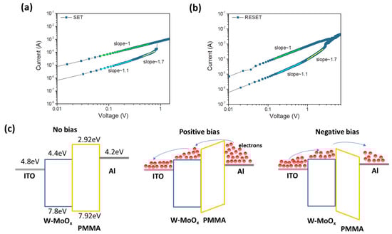 I-V curve analysis for conductive mechanism of the W-MoOx/PMMA-based memristor during (a) SET and (b) RESET operation. (c) Schematic illustration of the conductive mechanism of the ITO/W-MoOx/PMMA/Al device without bias application (left), with positive bias (middle), and with negative bias (right).