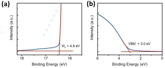 Figure 5c illustrates the conductive mechanism of the ITO/W-MoOx/PMMA/Al memristor, where the left panel shows the energy level diagram of the memristor without bias. The energy levels presented in Note S1 of the W-doped MoOx and PMMA films were estimated by cyclic voltammetry measurements, shown in Figure S8a,b, respectively []. The valence band (VB) of the W-MoOx sample was also estimated using ultraviolet photoelectron spectroscopy. Figure 6a,b show the high-energy cut-off and Fermi level regions of W-MoOx’s UPS spectrum, respectively. The VB of the doped oxide is located 3 eV below the Fermi level and thus is estimated at −7.8 eV, in accordance with the cyclic voltammetry measurement, while the work function (WF) is 4.8 eV. When a positive voltage is applied to the top electrode (middle panel of Figure 5c), energy level bending occurs and the electrons reach the W-MoOx layer, passing through the PMMA film. The electrons fill the traps in the W-MoOx layer attributed to the oxygen vacancies of the W-doped molybdenum oxide film, as revealed by the reflectance and PL measurement, and when the filling is completed (at VSET), the conductive filament is formed. Therefore, the memristor switches from the HRS to LRS. On the other hand, when a negative voltage is applied to the Al, the electrons move reversely, leading to the depletion of the W-MoOx, the disruption of the conductive filament, and thus the LRS-to-HRS transition.