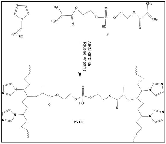 Schematic illustration for the synthesis of poly(vinylimidazole)-bis[2-(methacryloyloxy)ethyl] phosphate (PVIB).