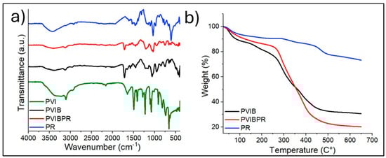 (a) FT-IR spectra of the PVIB, PVIBPR, PR. (b) TGA curves of PVIB, PVIBPR, PR.